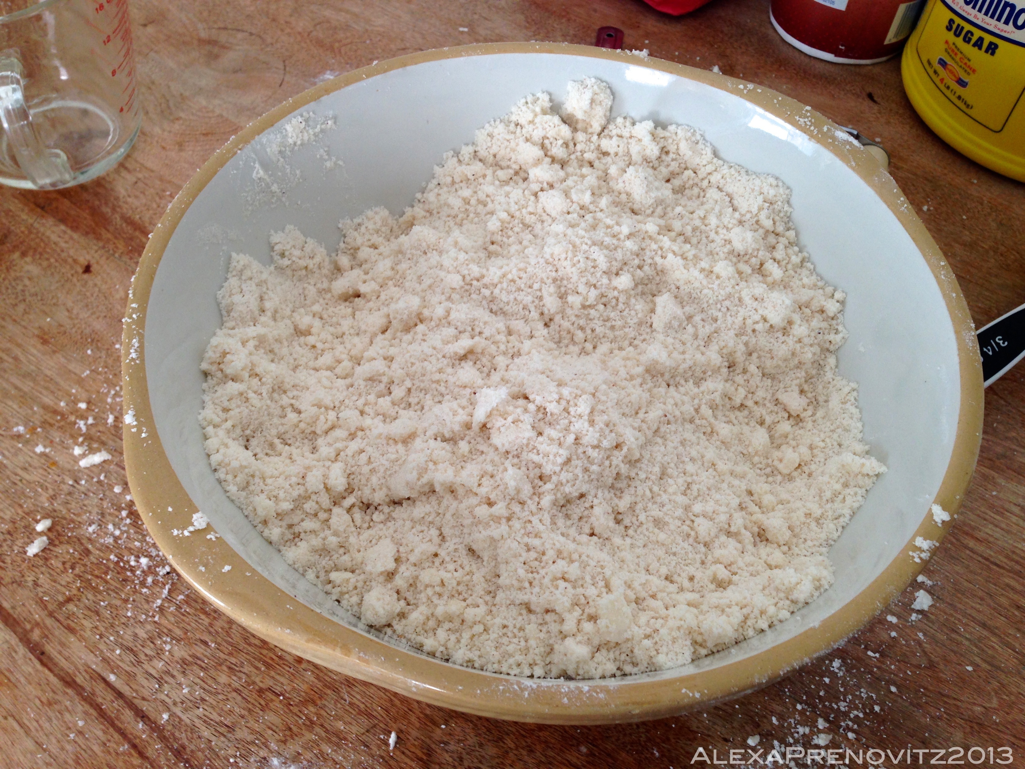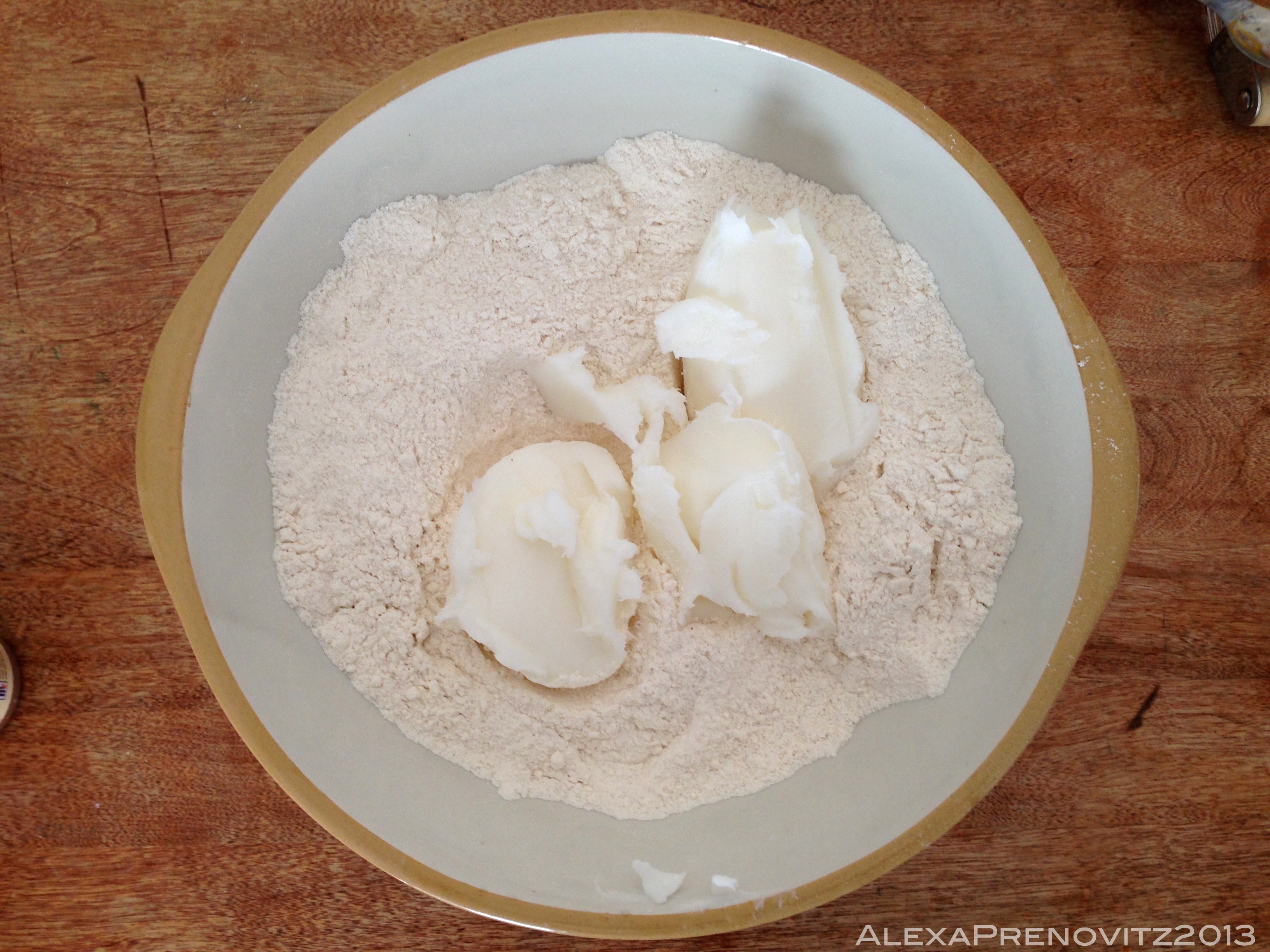 2. Add the lard (or butter/lard combo) and work together until the consistency of damp sand (I used a pastry cutter and my hands)