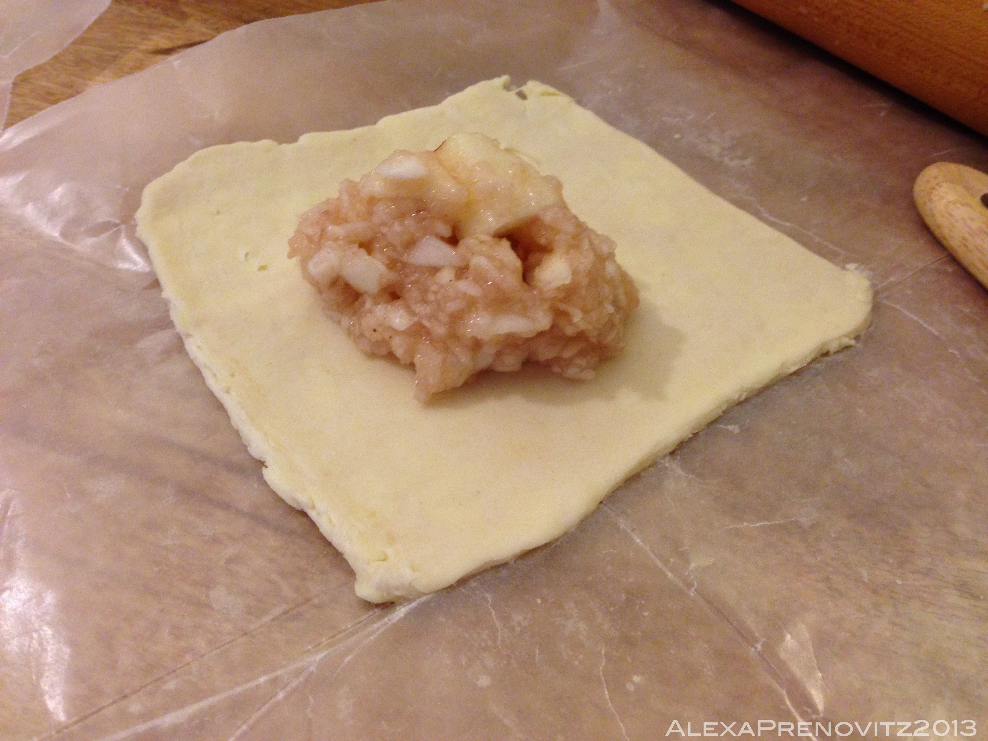 - Toss drained apples and applesauce together in separate bowl. Place 2 tablespoons of apple filling in center of each piece of dough (less if the dough shrinks like mine did after cutting into sections).