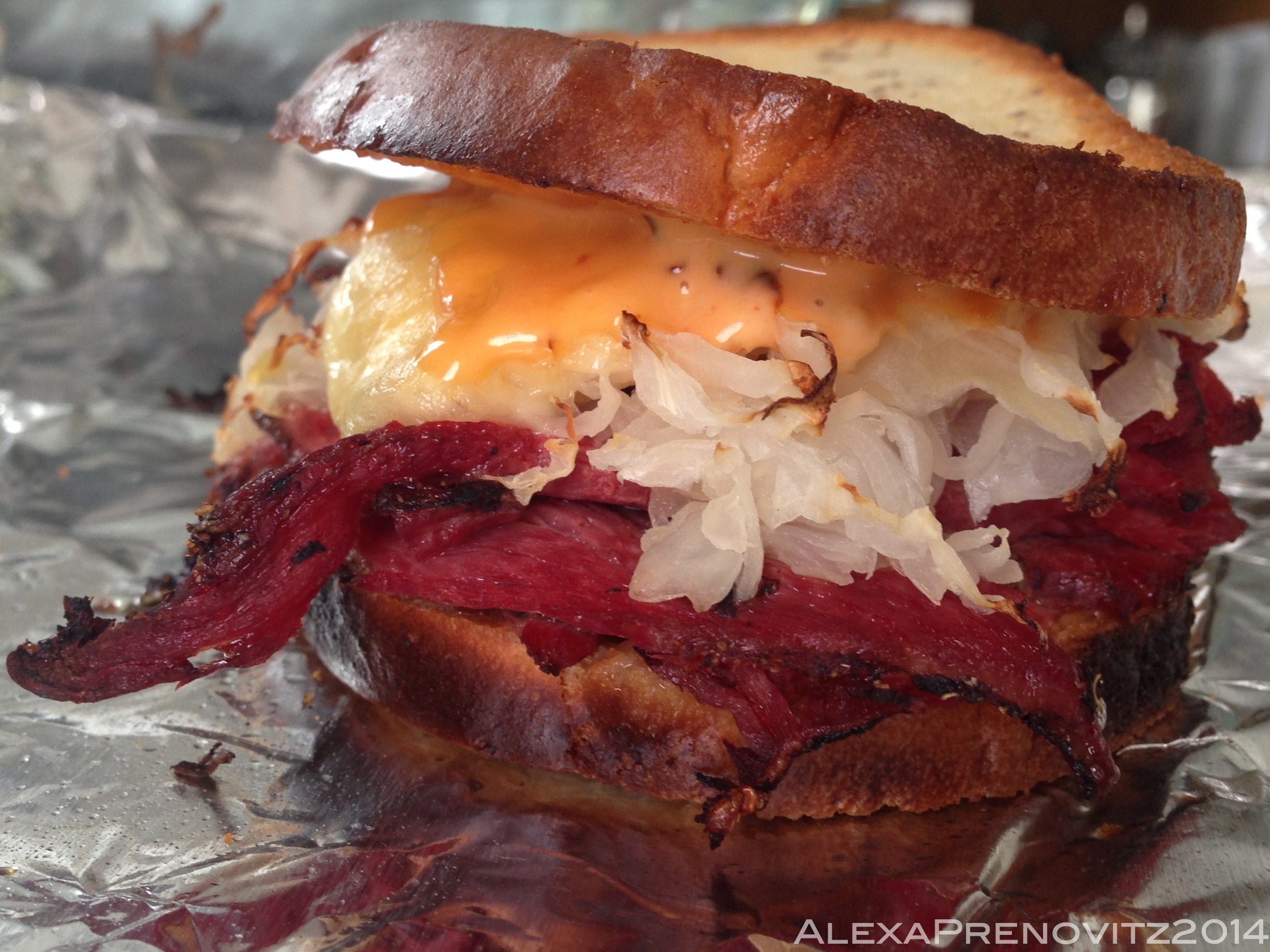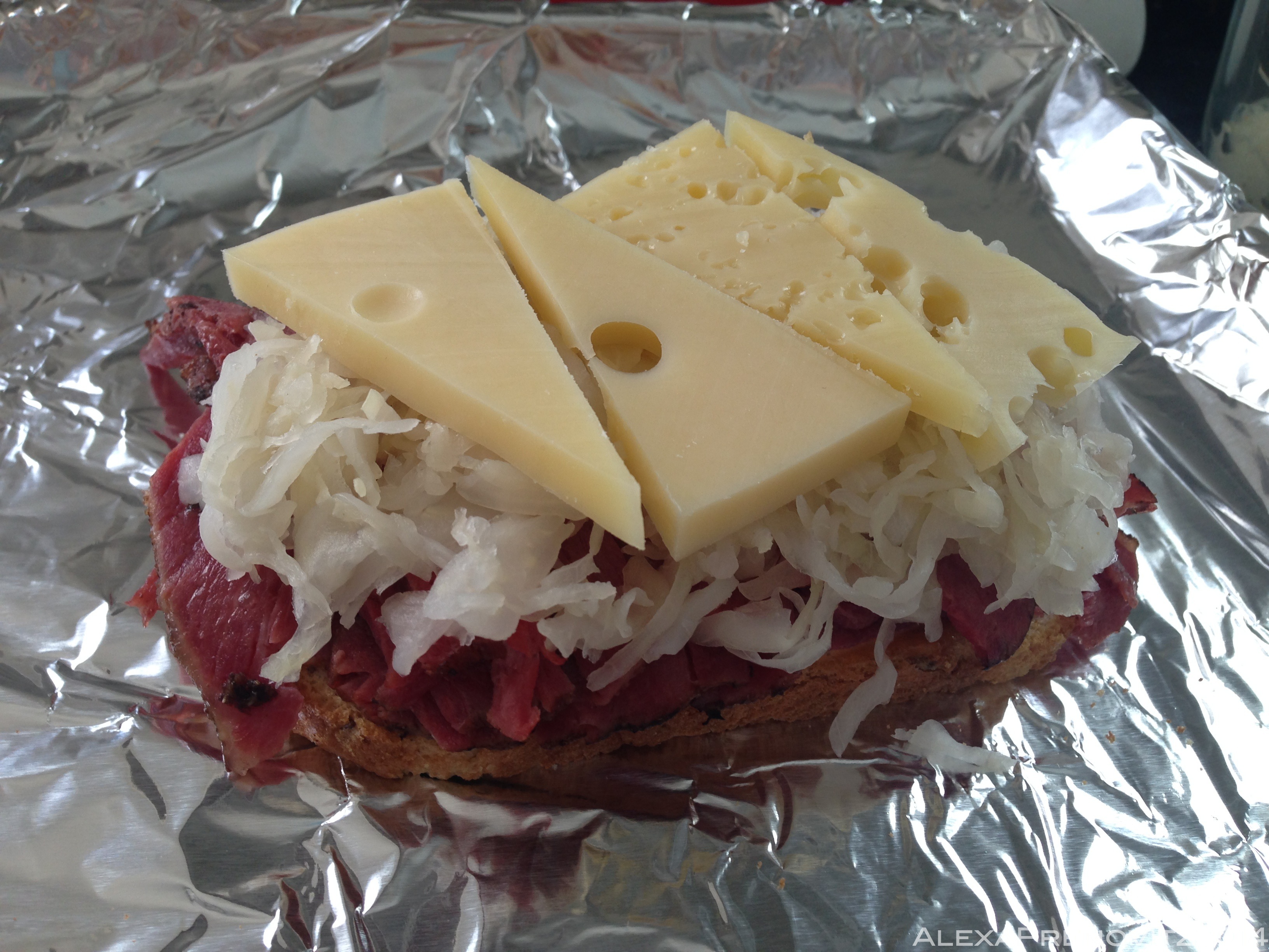Add a dollop of Russian dressing on top of the cheese and place the other toasted piece of bread on top. (For added richness, butter the toasted piece of bread and put it under the broiler until browned, then place on top of the sandwich)