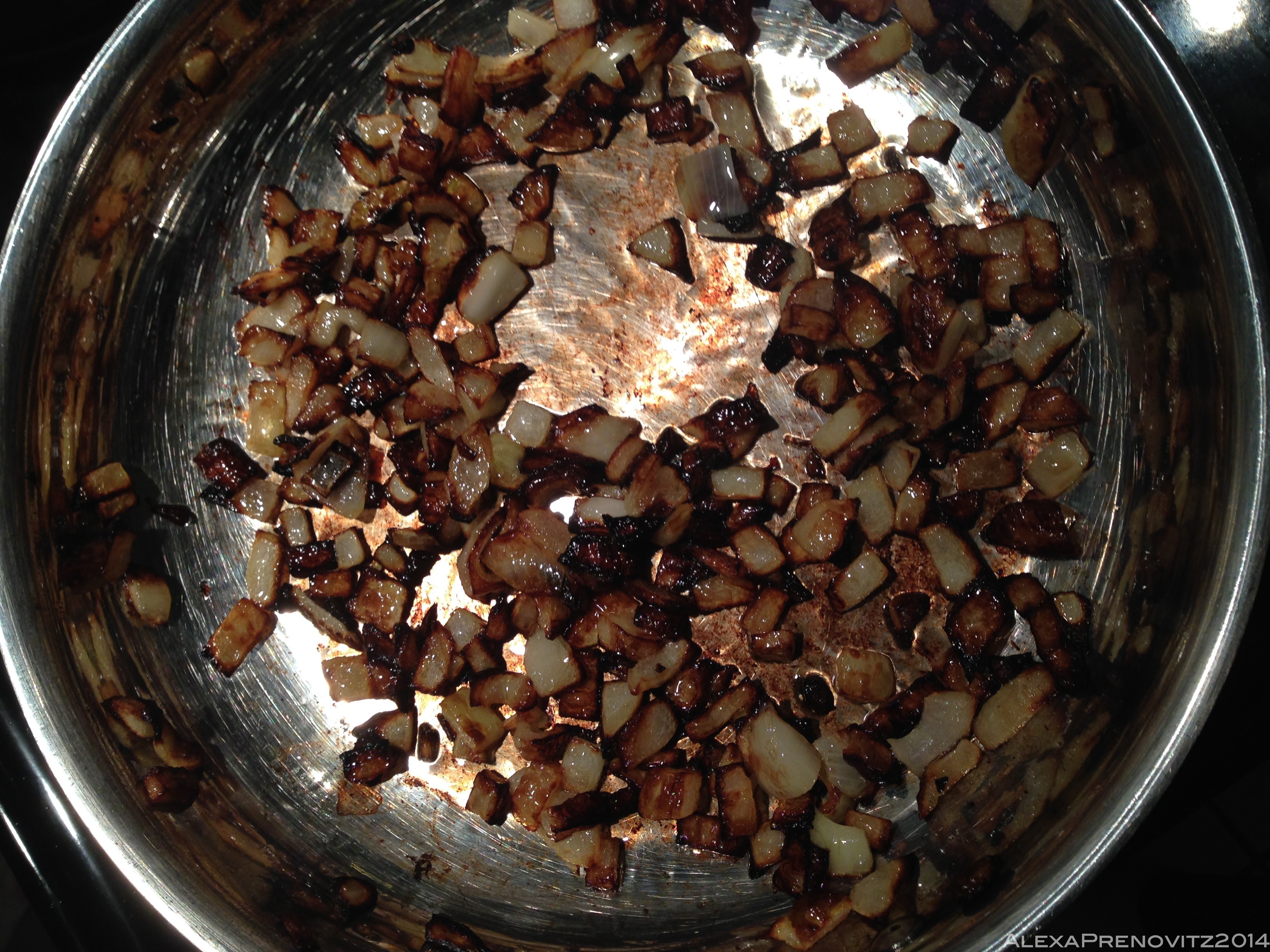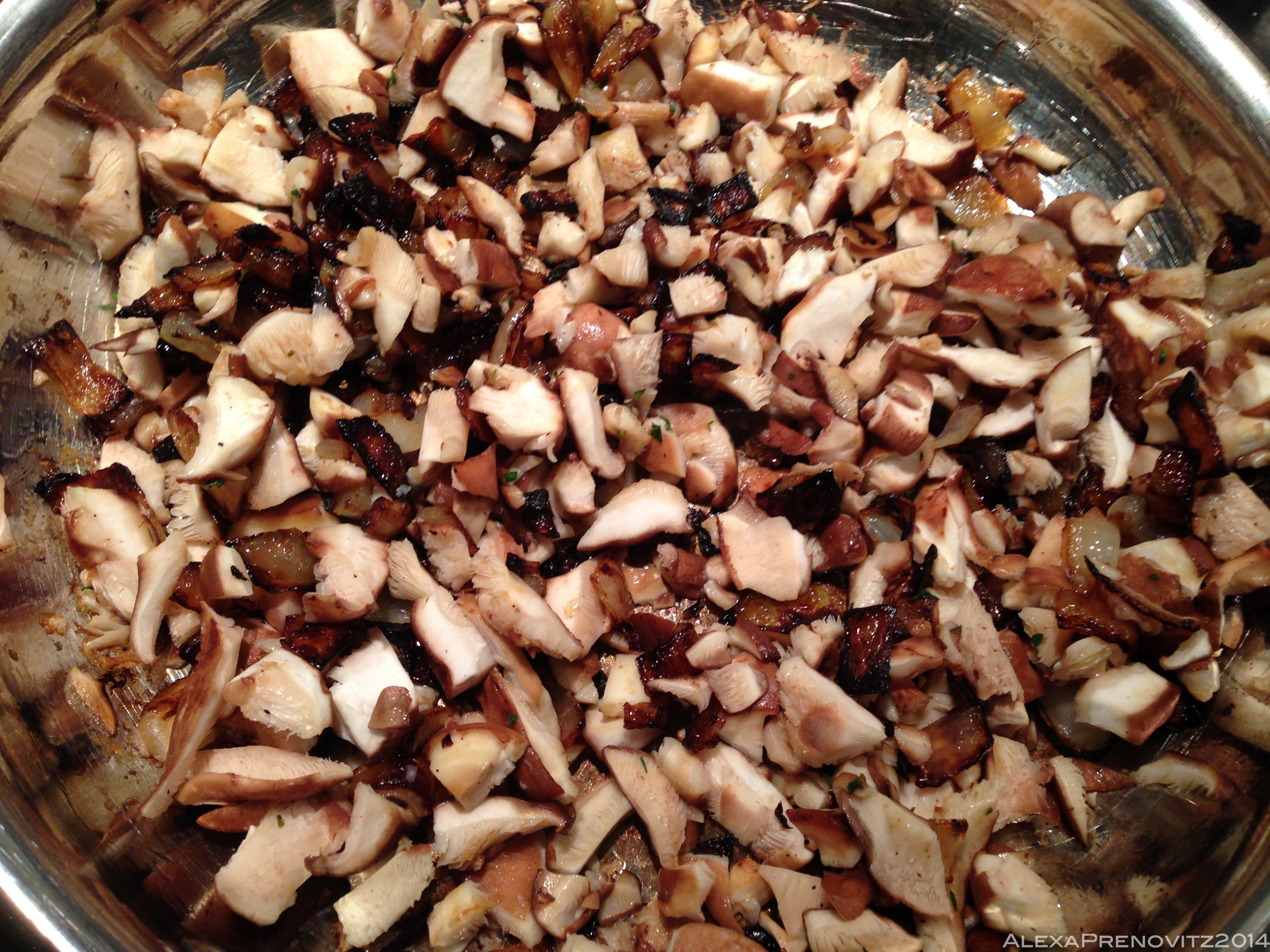 When they’re soft and have brown edges add the mushrooms and cook until they give off their moisture.