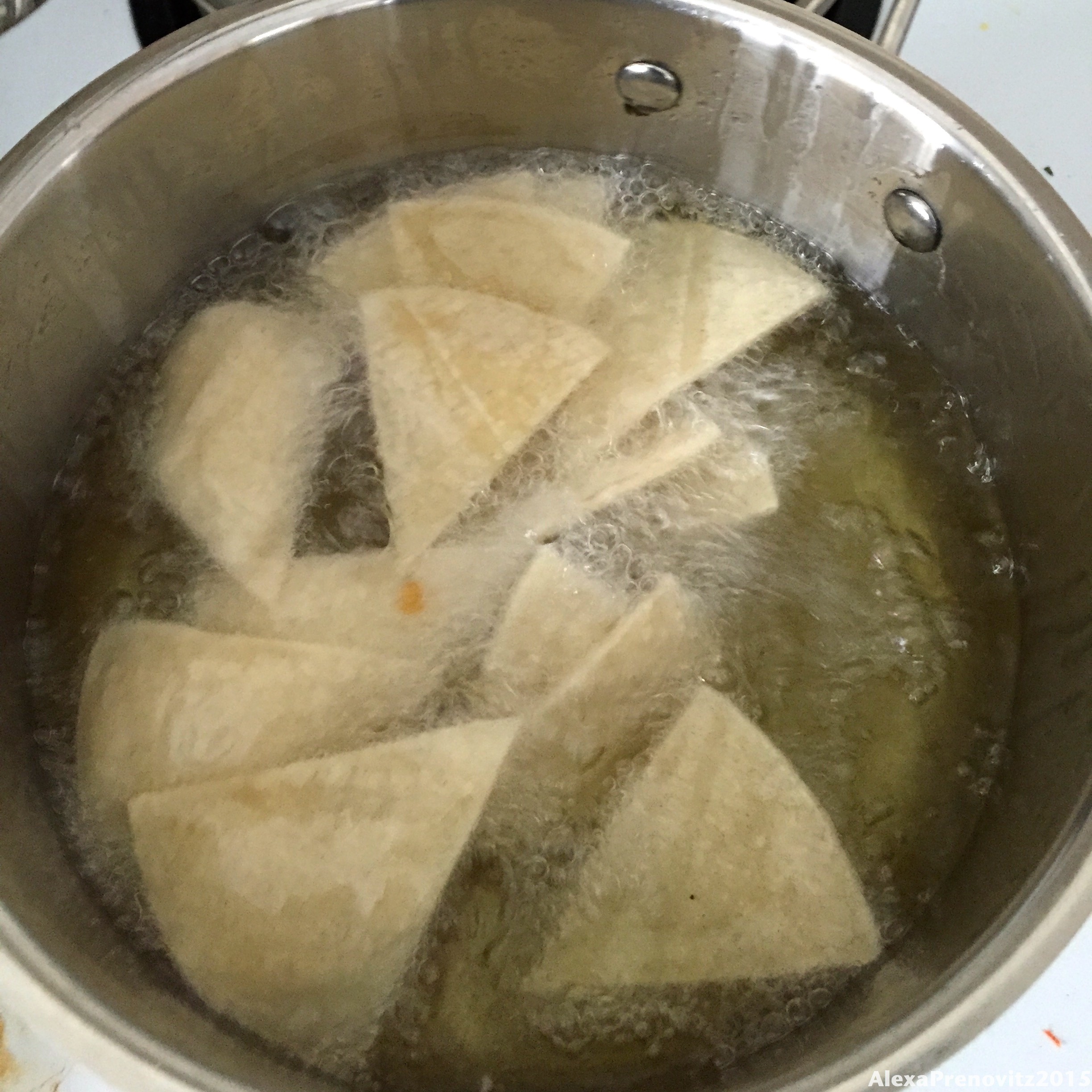 In batches, fry the wedges of tortilla, while moving them around with a wire basket scoopy thing so that they fry on both sides. Keep them in the oil until the bubbles settle down and they look lightly browned.