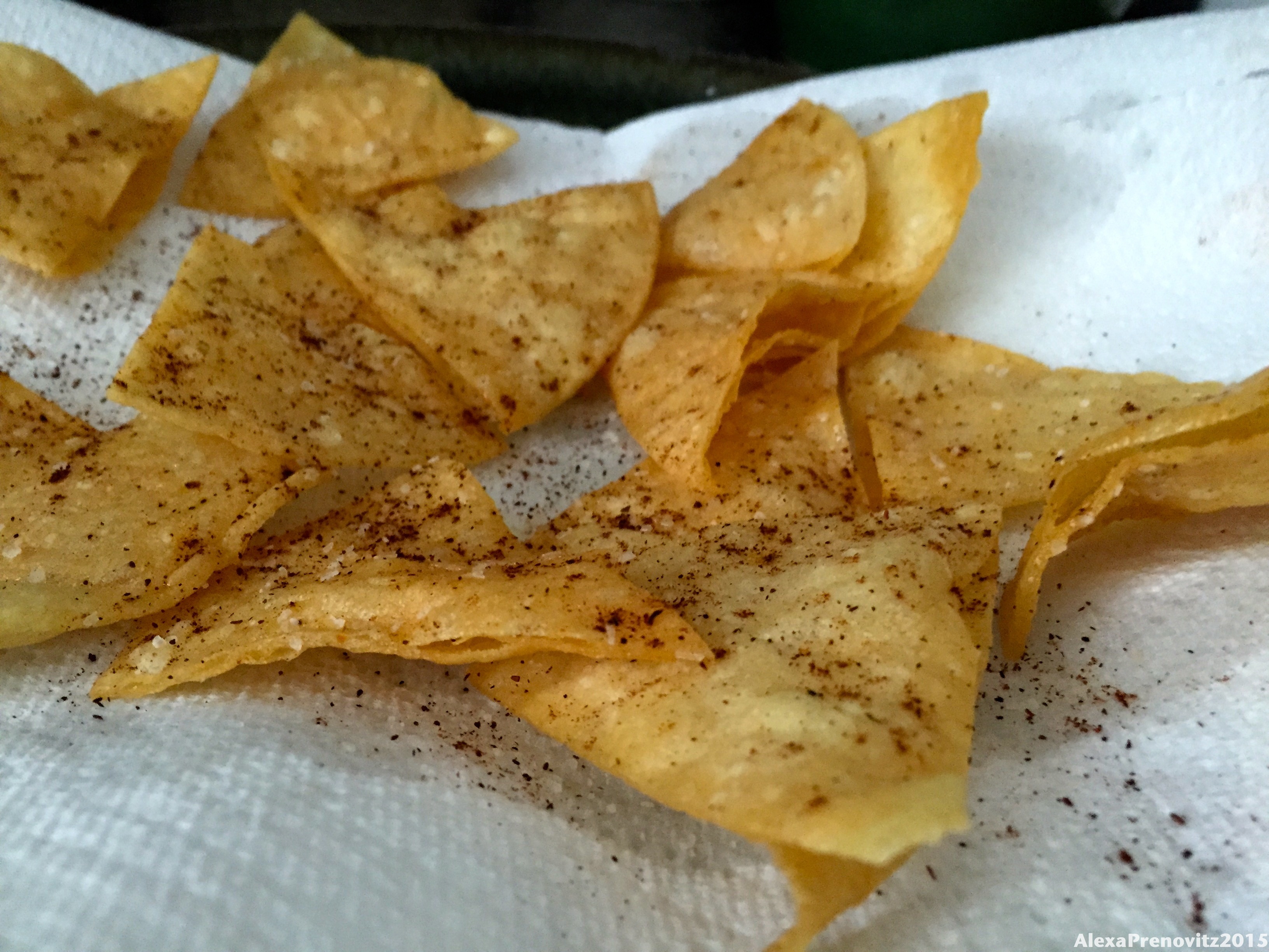 Using the wire basket thingy pull the chips out of the oil, tap over the pan so excess oil goes back in, put onto a paper towel to drain and immediately sprinkle them with salt and chili powder